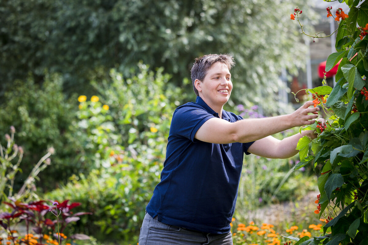 Ontspan in de theetuin en geniet van een kopje thee of koffie. Achter de kapschuur vind je de bijentuin met prachtige bijenplanten zoals Echinacea en Silphium, die oorspronkelijk uit de Amerikaanse prairie komen. Of maak een wandeling door de belevingstuin bij Passiflora, aangepast voor rolstoelen zodat iedereen kan genieten van de bloemen en planten. Een deel is zelfs een pluktuin!