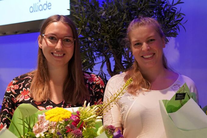 Jaarlijks worden binnen Alliade veel (afstudeer)onderzoeken uitgevoerd, zowel door Alliade-medewerkers die een vervolgopleiding doen als door studenten van buitenaf. Allemaal maken ze kans op de PWO Scriptieprijs, die wordt toegekend aan studenten met een bijzondere persoonlijke groei en een scriptie van hoge wetenschappelijke kwaliteit en relevantie voor de praktijk. De winnaars van 2023: José Themmen (ouderenzorg) en Sophie de Jager (gehandicaptenzorg)! Tijdens de Alliade Kennisdag op 1 juli reikte Elze Vonk, lid van de Raad van Bestuur, de prijs aan hen uit.