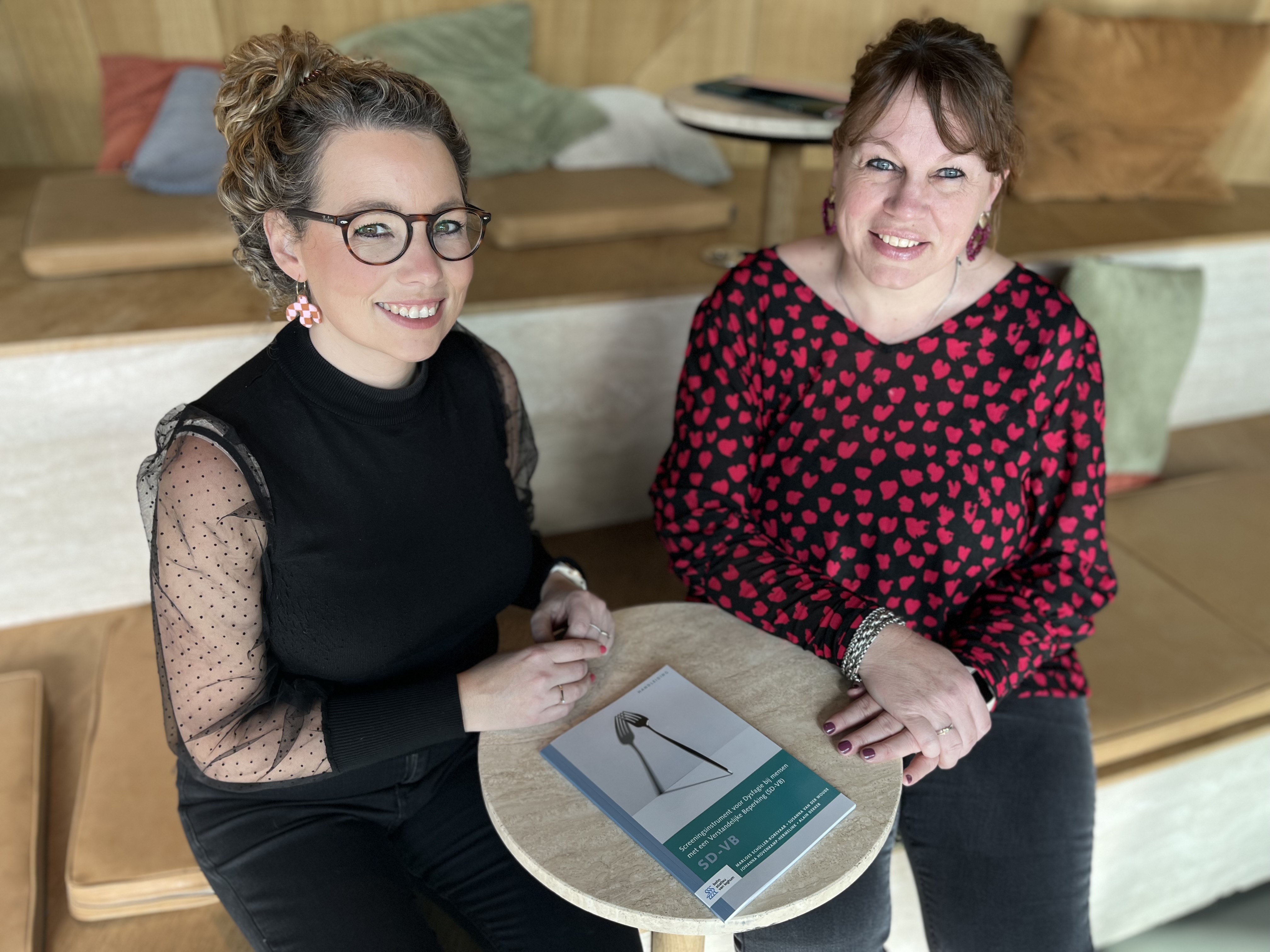 Susanna: ‘We deden een klein onderzoekje om te kijken of dat idee klopte. We zochten een vragenlijst uit die in de gehandicaptenzorg veel gebruikt werd, om te bepalen of iemand een verhoogd risico op dysfagie heeft.’ Marloes vertelt verder: ‘Deze vragenlijst vulden we in met een cliënt in gedachten waarvan we zeker wisten dat hij dysfagie had. Maar volgens deze vragenlijst was dat niet het geval. Dus gingen we op zoek naar een instrument dat breder keek dan alleen (ver)slikken. Dat bleek er niet te zijn. Zo begon de ontwikkeling van het Screeningsinstrument voor Dysfagie bij mensen met een Verstandelijke Beperking (SD-VB).’