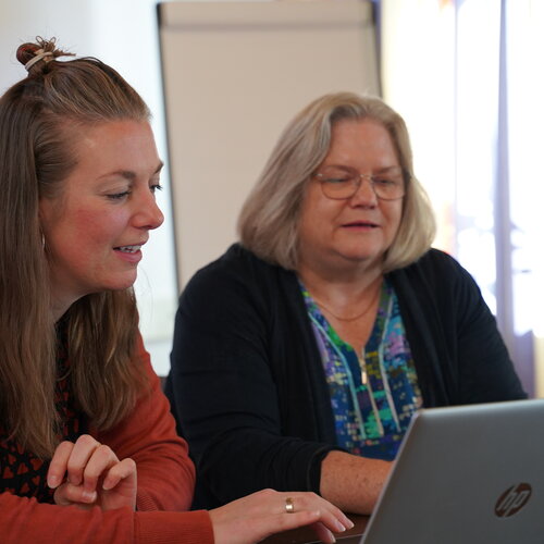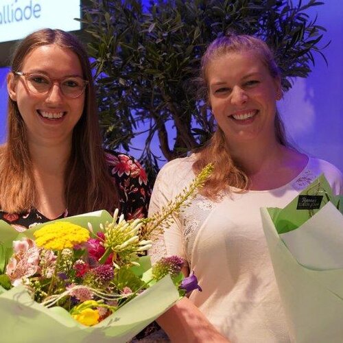 Elze Vonk (lid van de Raad van Bestuur) overhandigde de PWO-scriptieprijzen dit jaar aan José Themmen (geriatriefysiotherapeut in de ouderenzorg) en Sophie de Jager (gedragskundige in de gehandicaptenzorg).