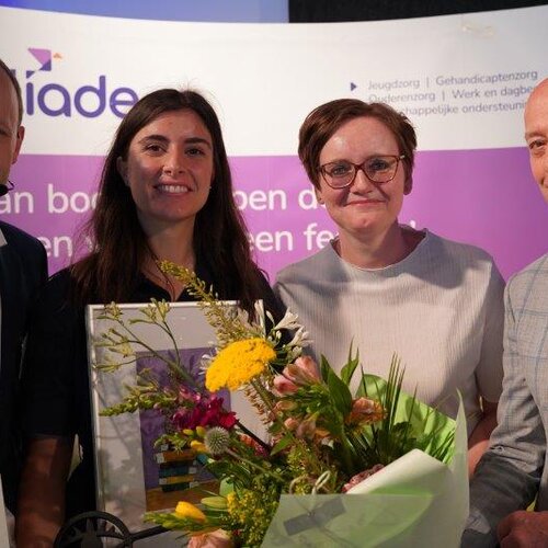 Aurora Ulgiati (gedragskundige bij Alliade gehandicaptenzorg en onderzoeker bij PWO) ontving uit handen van Vincent Maas (voorzitter van de Raad van Bestuur) de PWO Stimuleringsprijs 2023. Compleet verrast nam zij haar prijs in ontvangst. Lees op de site van PWO waarom de prijs dit jaar naar Aurora ging.